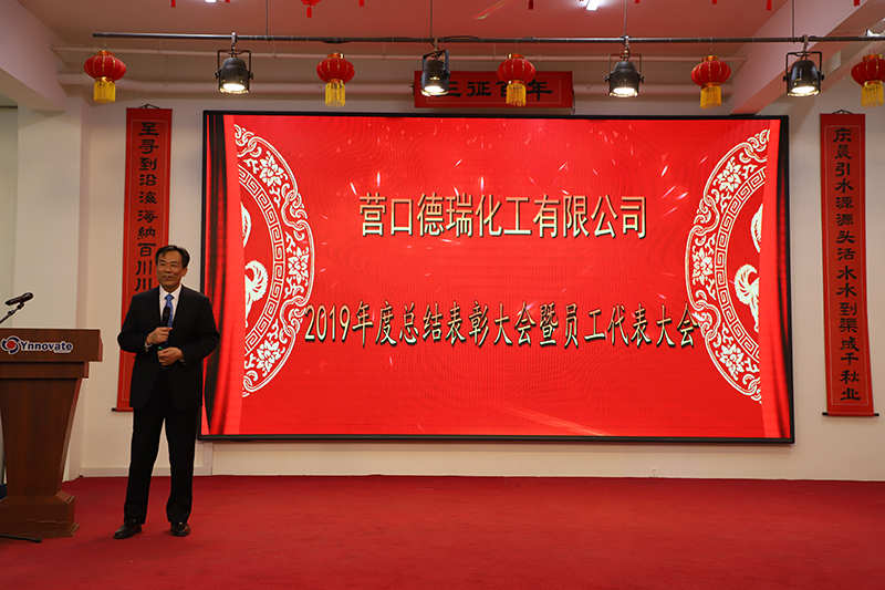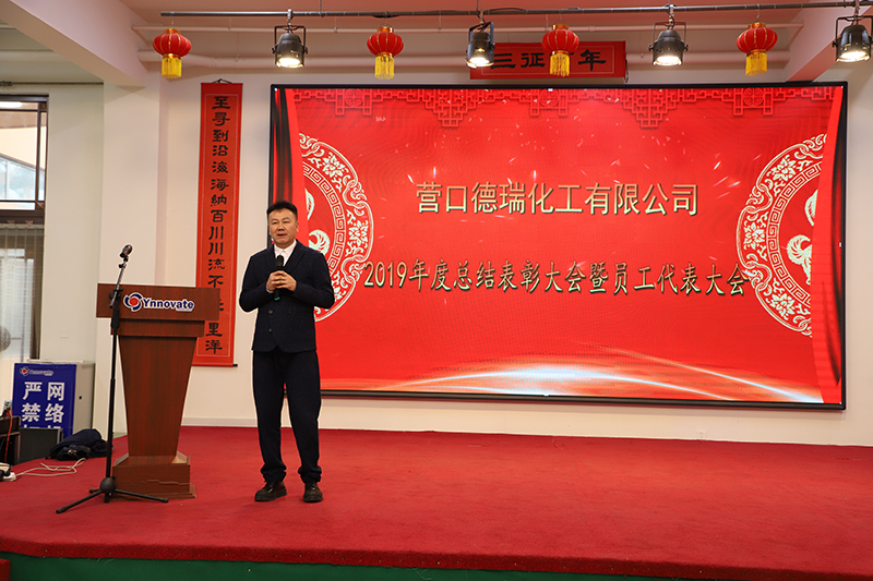 2020年1月22日上午9:00,營口德瑞化工有限公司2019年度總結表彰大會暨員工代表大會在員工食堂隆重召開,“三征”創始人劉慶晨教授,盛海投資董事長、營創三征黨委書記劉至尋先生,營新科技生產總監劉健先生,營創三征行政總監商富麗女士,營創三征ESH總監齊長亮先生,德瑞化工全體管理層及員工代表,共計150余人出席了大會,公司副總經理周永強先生主持會議。